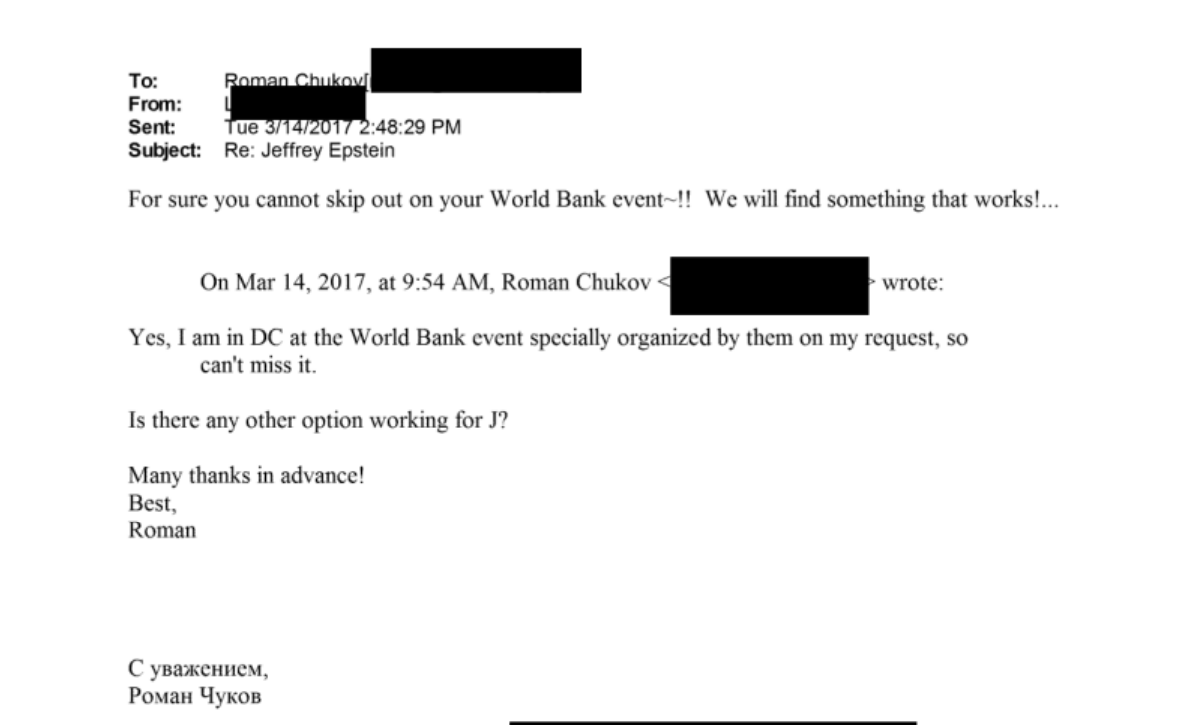 Но Вуди Аллен на ПМЭФ не приехал. Впрочем, были и те, кто очень хотел встретиться с самим Эпштейном — например, Роман Чуков проявлял огромную заинтересованность. О нём финансисту сообщили в феврале (почта, с которой отправлено письмо, зацензурена: