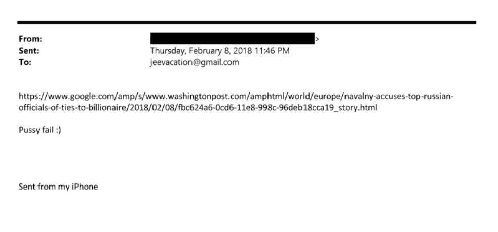 Российский контекст всплывает и иначе. Например, некто в 2018 году отправил Эпштейну статью The Washington Post о Насте Рыбке и Олеге Дерипаске, добавив ироничный комментарий.