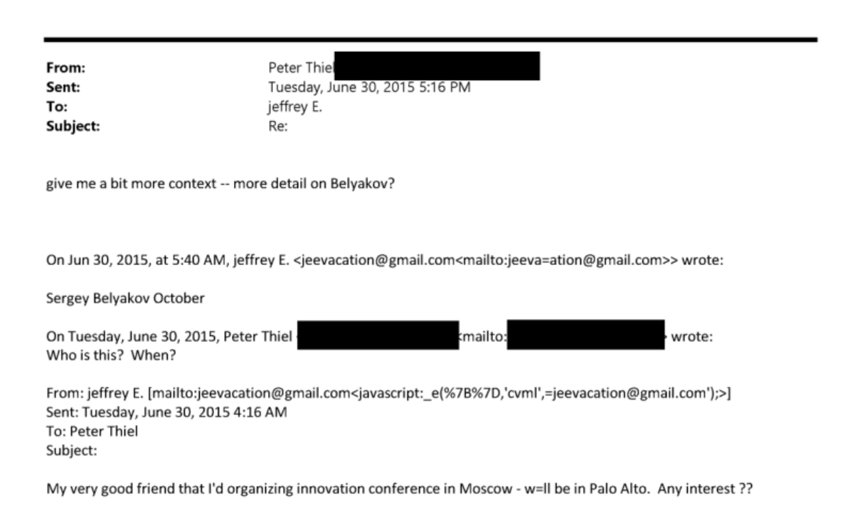 В 2015 году Эпштейн в переписке с Питером Тилем (инвестором, основателем Paypal) упоминает «очень хорошего друга», а затем называет его имя — Сергей Беляков.