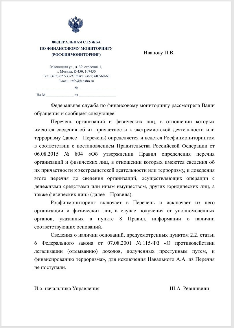 Об этом ведомство сообщило в ответ на запрос журналиста «Соты»: сведения от «уполномоченных органов» в Росфинмониторинг не поступали – без них, согласно ответу, исключение невозможно.