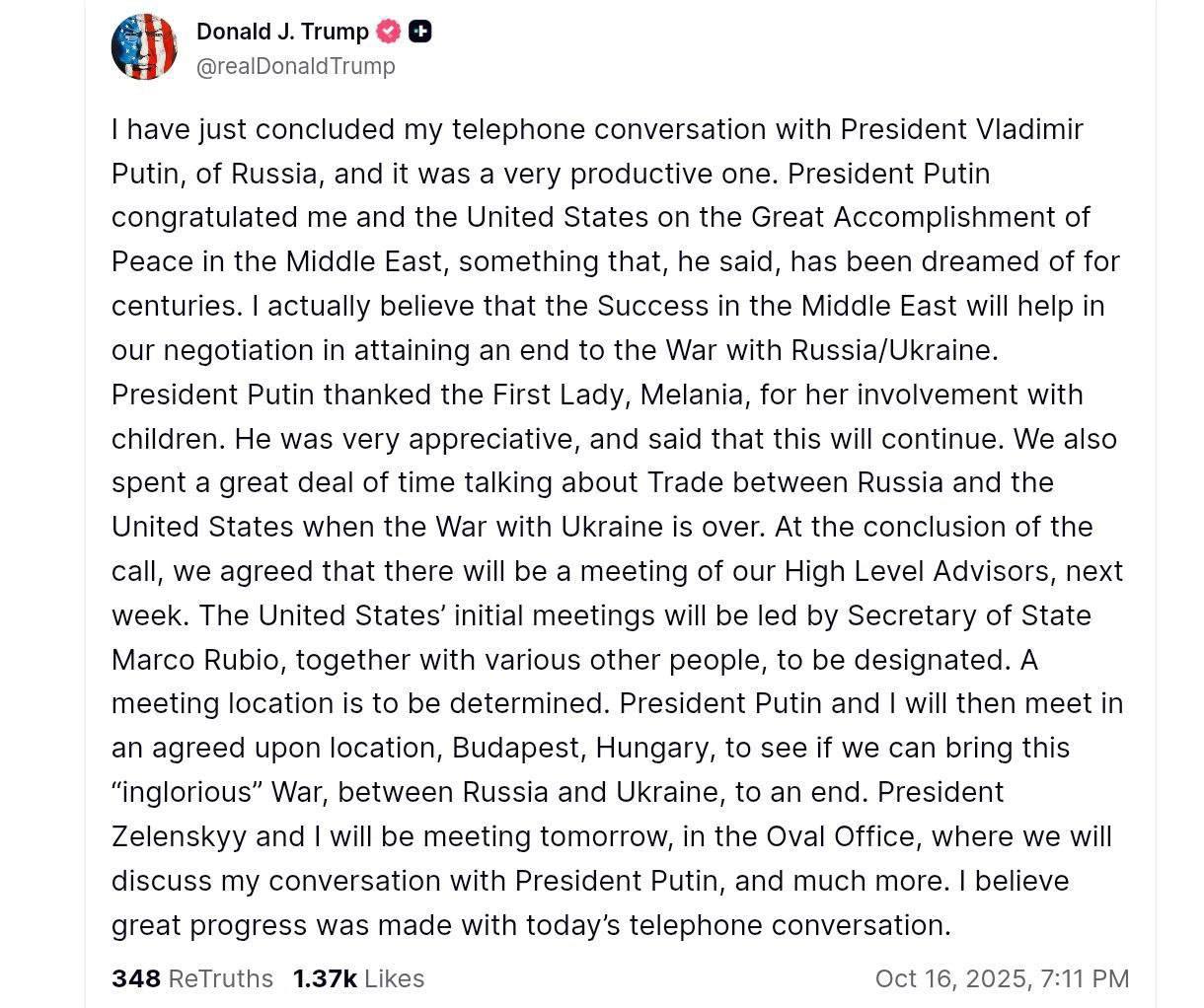 По словам Трампа, уже на следующей неделе встречу проведут высокопоставленные американские и российские чиновники (со стороны США делегацию возглавит госсекретарь Марко Рубио).