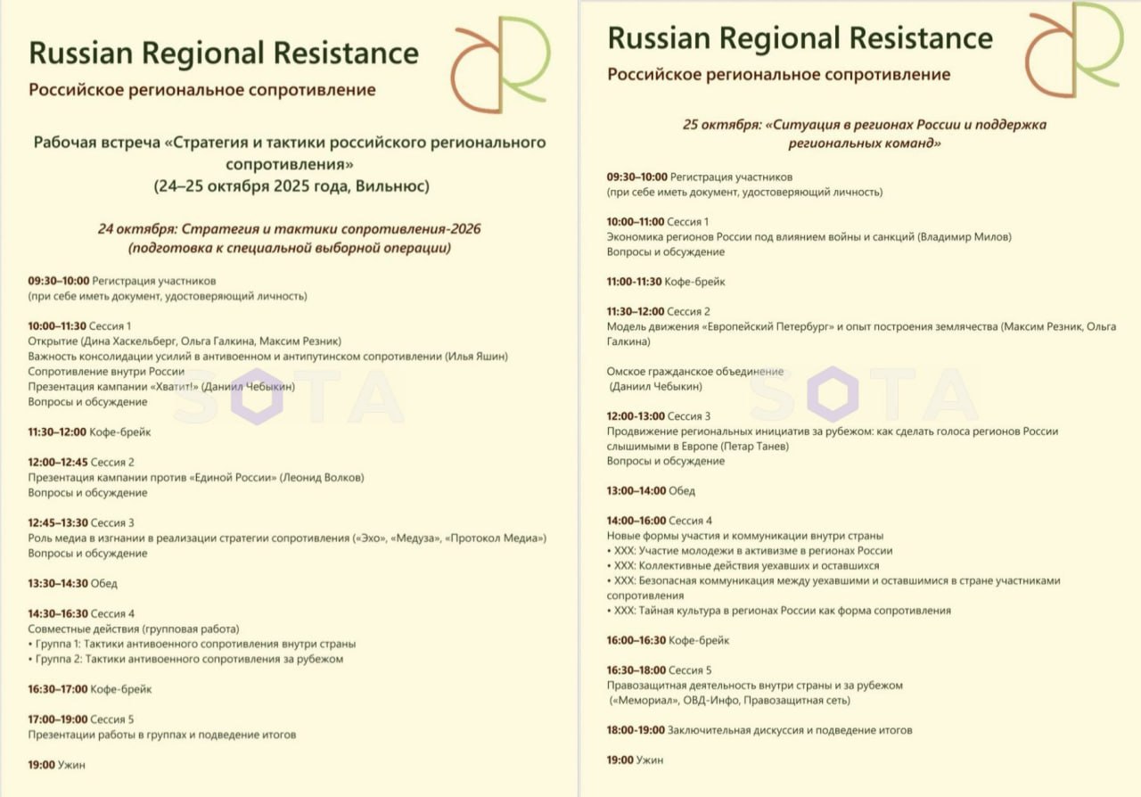 В распоряжении «Соты» оказалась программа конференции «Стратегия и тактики российского регионального сопротивления», которая пройдет в Вильнюсе 24-25 октября. Вчера об отказе ему в участии в этом мероприятии рассказал бывший глава «Открытой России» и экс-политзаключенный Андрей Пивоваров: по его словам, приглашение ему сначала выслал, а потом отозвал бывший депутат петербургского парламента Максим Резник. В ответ на пост Пивоварова Леонид Волков заявил, что Леонид Невзлин помогал в эвакуации бывшей жены Пивоварова из России и опубликовал фото ее ВНЖ.