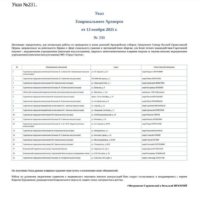Саратовская епархия РПЦ распорядилась направить православных священников почти во все женские консультации и перинатальные центры города. Это следует из указа №231 митрополита Саратовского и Вольского Игнатия.