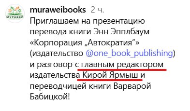 Сегодня из анонса берлинского книжного магазина «Муравей» стало известно, что главным редактором One Book Publishing стала пресс-секретарь сначала Алексея, а сейчас Юлии Навальной Кира Ярмыш, о чем ранее не сообщалось.