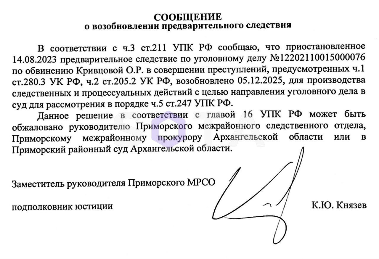 Напомним, против бывшей студентки САФУ Олеси Кривцовой заведены уголовные дела по статьям о «дискредитации ВС РФ» и «оправдании терроризма». Несмотря на домашний арест, в марте 2023 года ей удалось уехать из России. В РФ она вскоре была заочно арестована и объявлена в розыск.