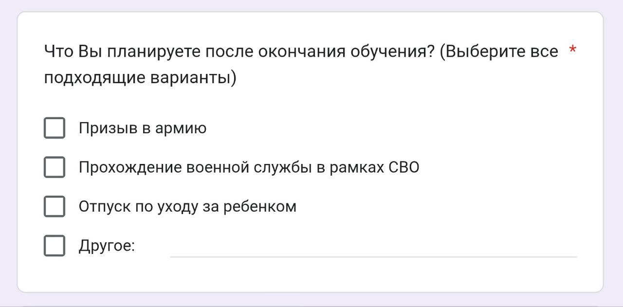 Тем не менее в самом опросе, который требуют пройти от студентов, варианта трудоустройства и карьеры нет. Основными вариантами являются уход в армию и деторождение, все остальное оставлено на пункт «Другое».