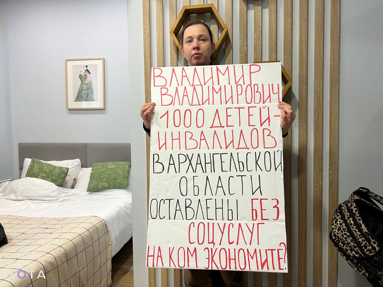 На подобную акцию она выходит не первый раз, добиваясь возвращения соцуслуг для больных детей в Архангельской области.