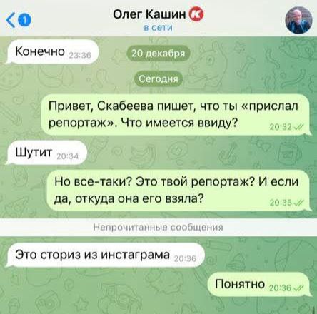 После этого бывший работодатель Пархоменко Алексей Венедиктов связался с Кашиным, который сообщил, что Скабеева взяла его видео из сториз инстаграма (см. скриншот).