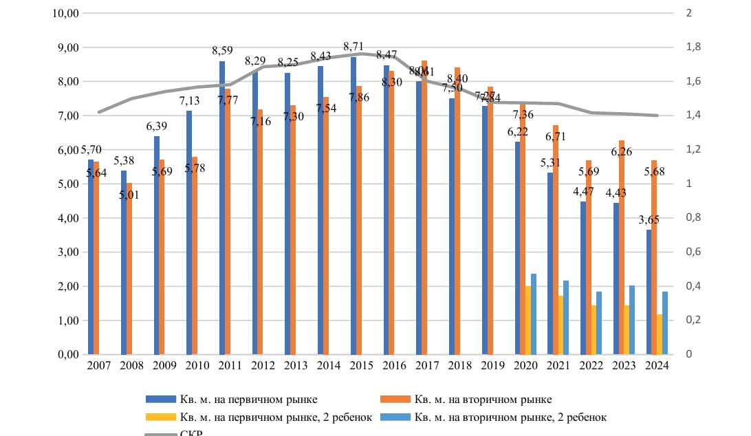 В 2015 году размер федеральной выплаты составлял 453 тыс. рублей и предоставлялся только при рождении второго ребенка — тогда этой суммы в среднем хватало на 8,7 кв. м в новостройке. К концу 2024 года показатель сократился до 3,6 кв. м, а в 2025-м — до 3,6 кв. м, несмотря на то, что сумма выплаты за второго ребенка увеличивалась и был введен сертификат и за первого ребенка.