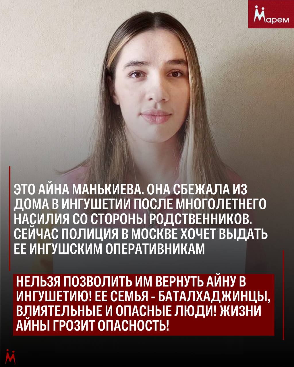 «Марем» и «СК SOS» просят звонить в полицию и требовать не допустить выдачи девушки в Ингушетию, а также по возможности приехать к отделу: