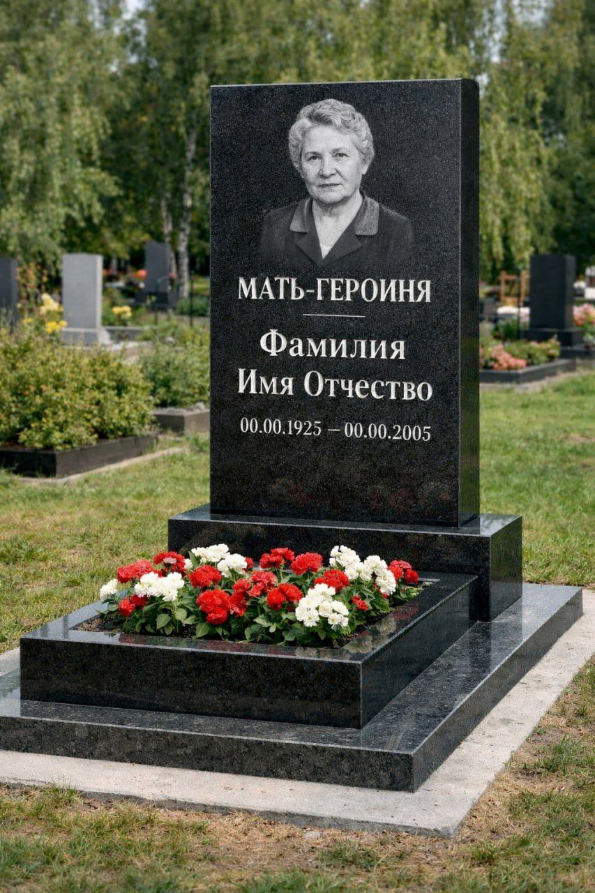 Параметры из документа: мрамор или гранит, вертикальная плита (размером 200 x 90 x 25 сантиметров), цоколь (размером 100 x 40 x 30 сантиметров), цветник (размером 150 x 90 x 25 сантиметров), бетонное основание. В надписях на надгробии обязательно указываются звание «Мать-героиня», фамилия, имя, отчество и даты жизни.
