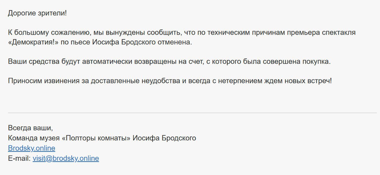 Официально премьера не состоится «по техническим причинам», как сообщается в рассылке для купивших билеты зрителей вместе с уведомлением о возврате денег. Неофициально причиной отмены называют критику в анонимных телеграм-каналах, в том числе в канале «Закулиска»: 16 января в канале появился пост с критикой руководства музея, а сам спектакль именовался «фигой, которая и в карман не помещается» из-за режиссера, «на провокации которого уже несколько лет старательно никто не отвечает», и участия Марии Шалаевой, названной «релокантки-таксистки». В публикации содержалась также завуалированная угроза доноса и проблем для музея: