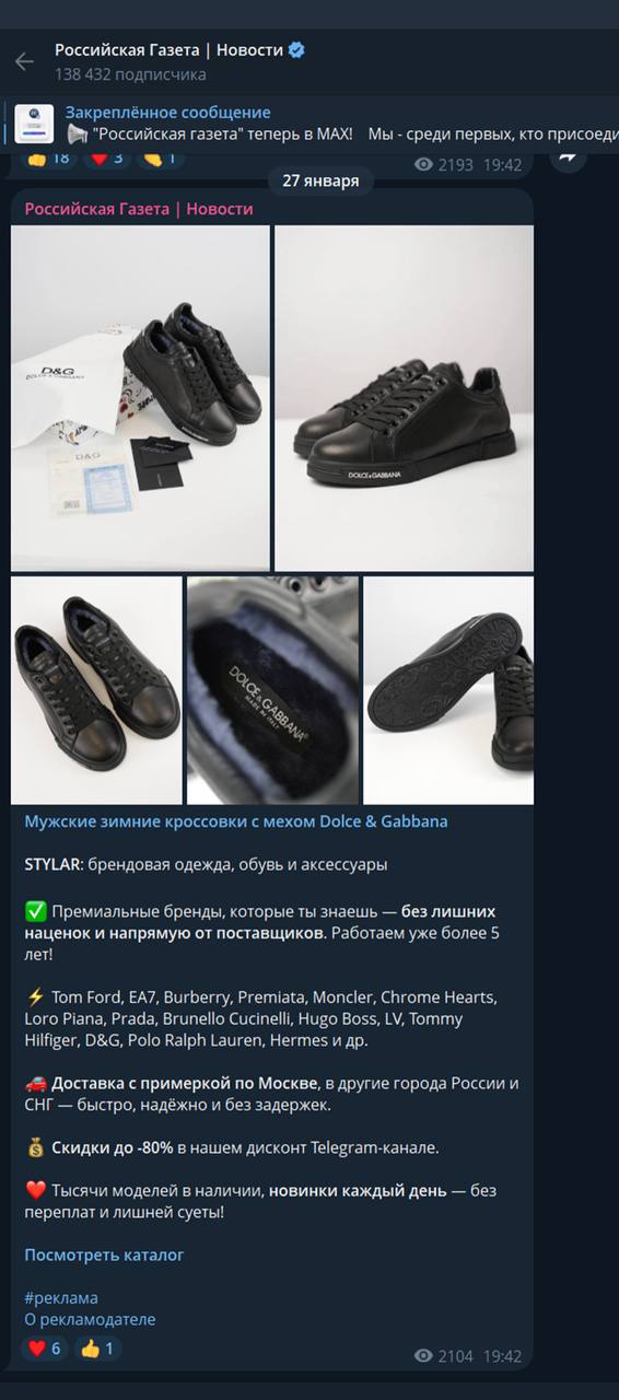 Официальный телеграм-канал издания разместил рекламу магазина, продающего товары западных люксовых марок, в частности, обуви модного дома Dolce&Gabbana, основатели которого являются открытыми геями. Напомним, власти России считают несуществующее «движение ЛГБТ» экстремистским.