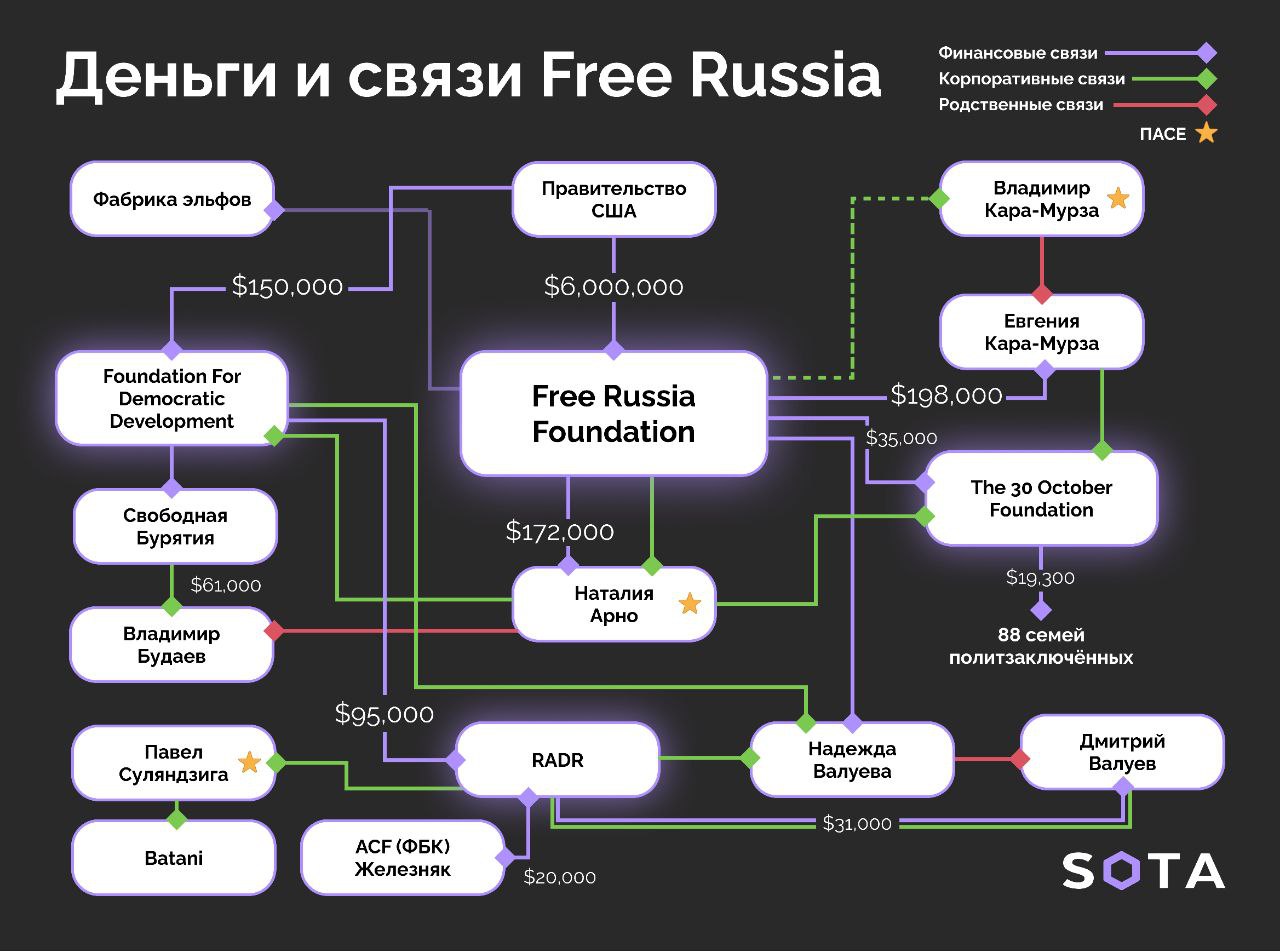 Помимо Free Russia (FRF) создательница этого НКО Наталия Арно входит в руководство еще двух американских некоммерческих организаций: это фонд Евгении Кара-Мурзы «30 октября» и Foundation for Democratic Development (FDD).