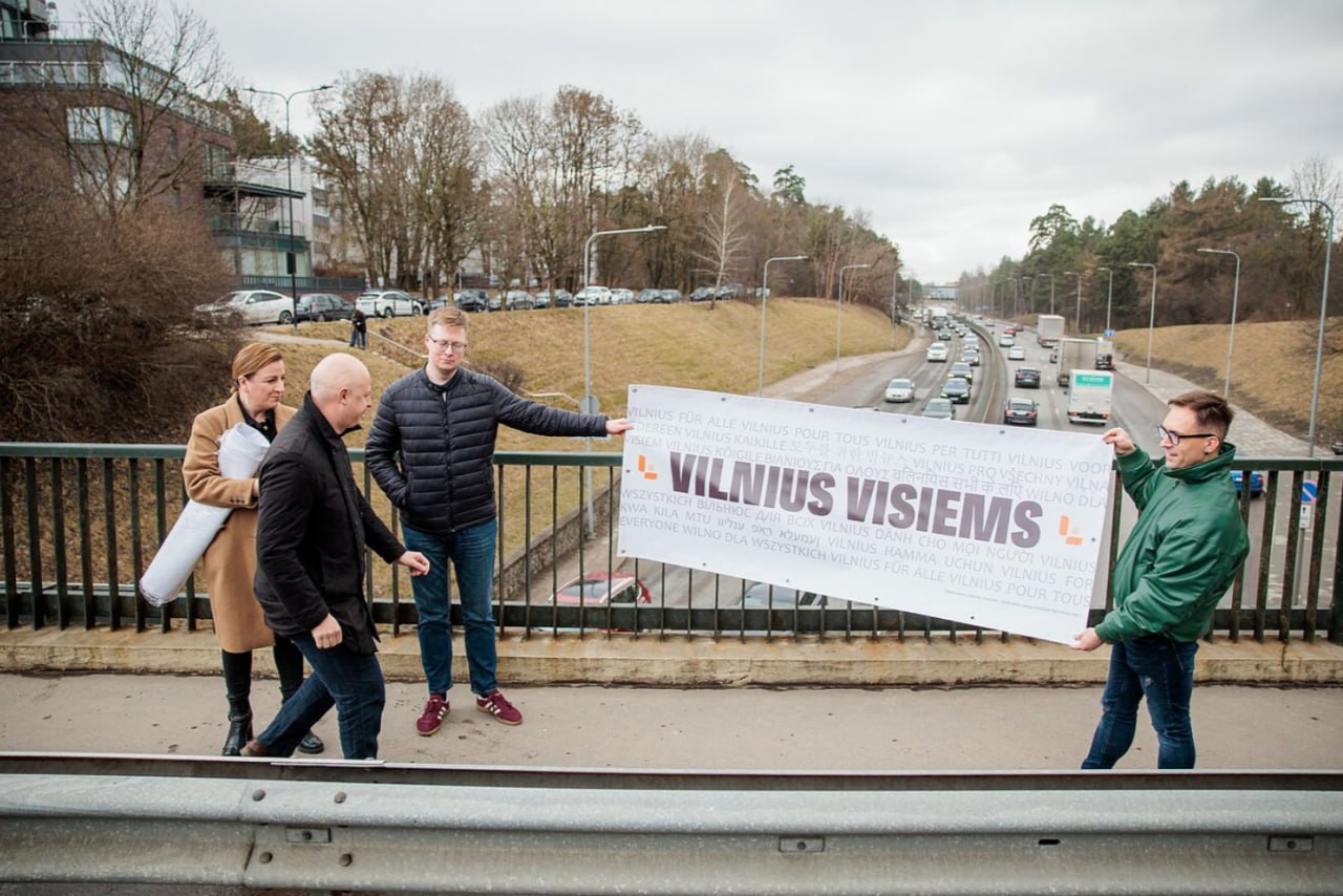 Новый баннер появился на мосту в парке Вингис. Его разместил депутат Сейма от либералов Симонас Гентвилас с единомышленниками, пишет LRT. Надпись на русском языке на многоязычном плакате отсутствует.