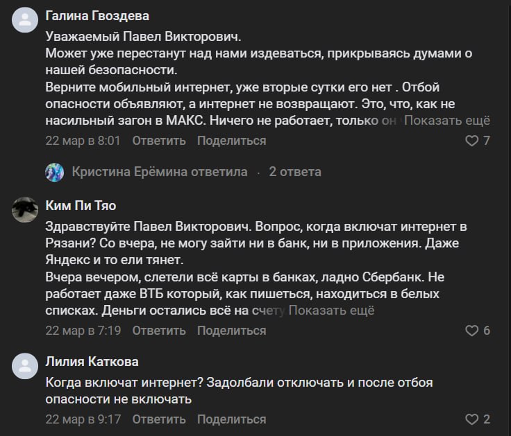 Под постами в социальных сетях губернатора Рязанской области Павла Малкова появилось множество комментариев от не довольных проблемами с доступом в Сеть.