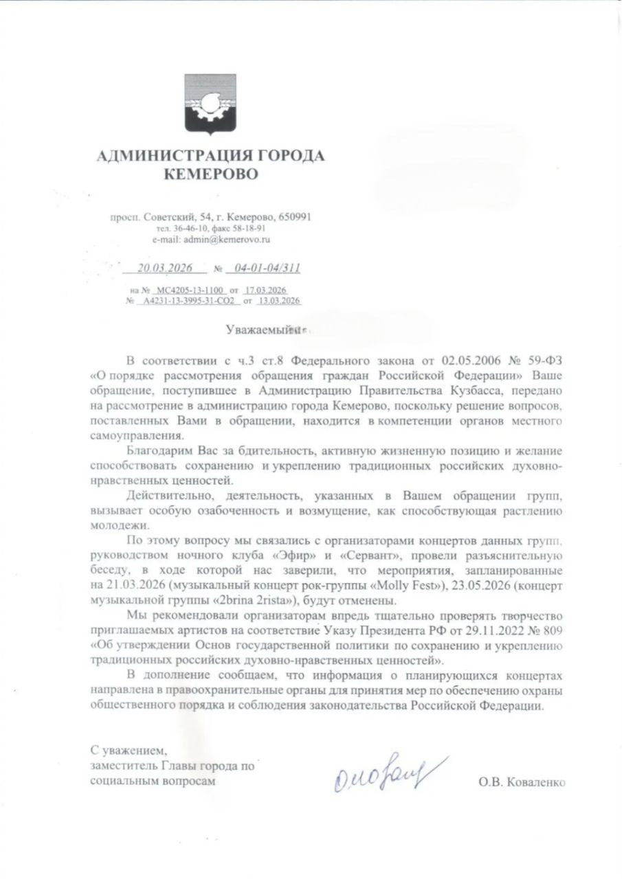 «Русская община» добилась отмены концертов 2rbina 2rista и Molly Fest в Кемерово