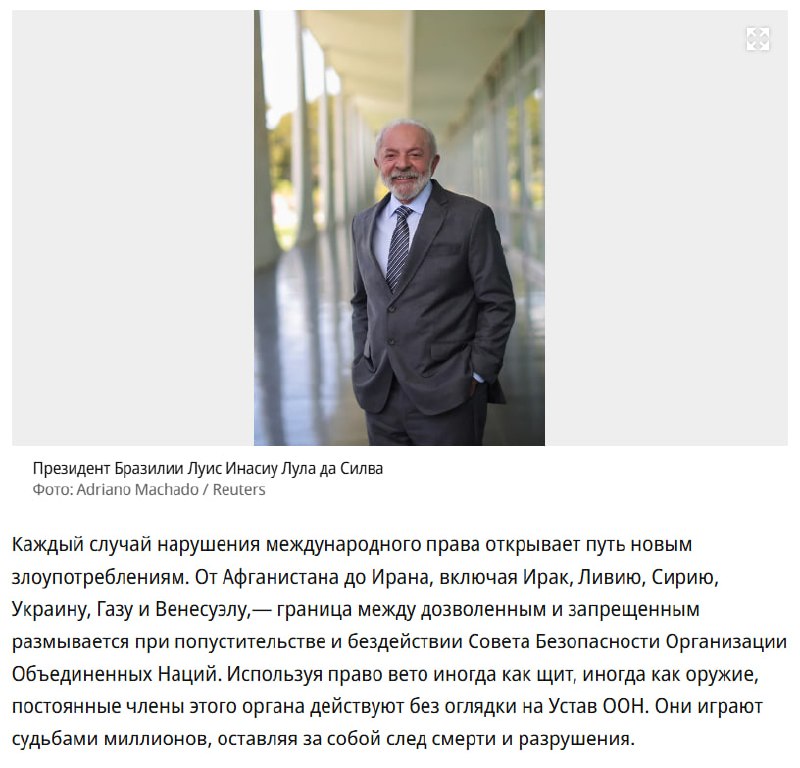 «Каждый случай нарушения международного права открывает путь новым злоупотреблениям. От Афганистана до Ирана, включая Ирак, Ливию, Сирию, Украину, Газу и Венесуэлу, — граница между дозволенным и запрещенным размывается при попустительстве и бездействии Совета Безопасности Организации Объединенных Наций. Используя право вето иногда как щит, иногда как оружие, постоянные члены этого органа действуют без оглядки на Устав ООН. Они играют судьбами миллионов, оставляя за собой след смерти и разрушения».