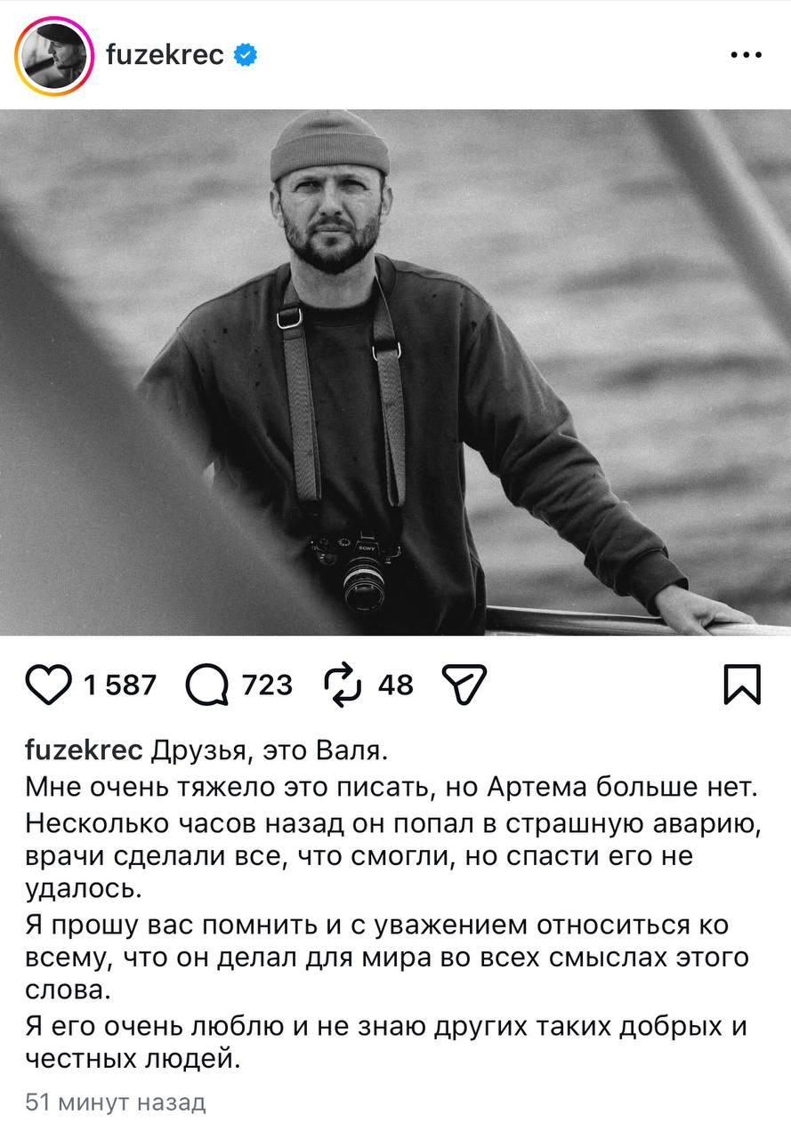 На 47-м году жизни погиб рэпер Артём «Fuze» Бровков — основатель и лидер петербургской группы Krec. О его смерти сообщила супруга Валентина Березкина. По её словам, музыкант попал в тяжёлую аварию, врачи не смогли его спасти.